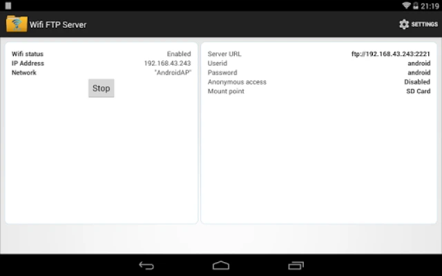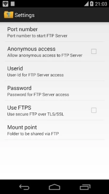 FTP Server yana cike da fasalulluka masu ƙarfi don ba ka cikakken iko. Za ka iya saita lambar tashar jiragen ruwa (port number) naka (ma'ana 2221) da kuma amfani da FTPS (FTP over TLS/SSL) don ƙarin tsaro, tabbatar da cewa bayanan da kake canja wuri suna da kariya. Wannan shiri kuma yana baka damar saita sunan mai amfani da kalmar sirri, tare da zabin kashe damar shiga ba tare da sanin suna ba (anonymous access) don tabbatar da sirrinka. Ka zaɓi babban fayil (home folder) naka ko ma na'urar SD card ta waje don adana fayilolinka yadda kake so.